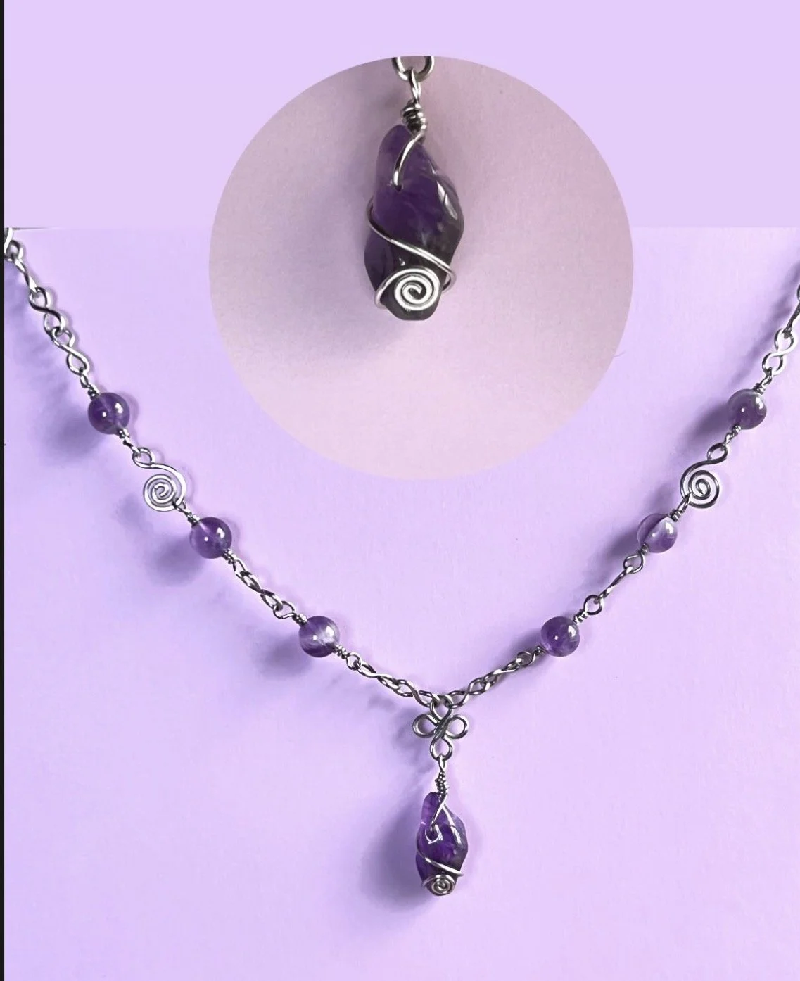 This handcrafted necklace showcases the natural beauty of amethyst in an elegant stainless steel design. The centerpiece features a polished amethyst stone wrapped in graceful stainless steel wirework, creating a refined, artistic pendant that catches the light beautifully. Each bead and link is arranged by hand, giving the piece a unique, artisan feel that blends sophistication with spiritual intention.